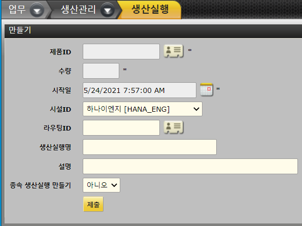2. 생산을 수행할 제품ID, 수량, 작업시작일, 시설, 라우팅ID, 생산실행명을 입력합니다.