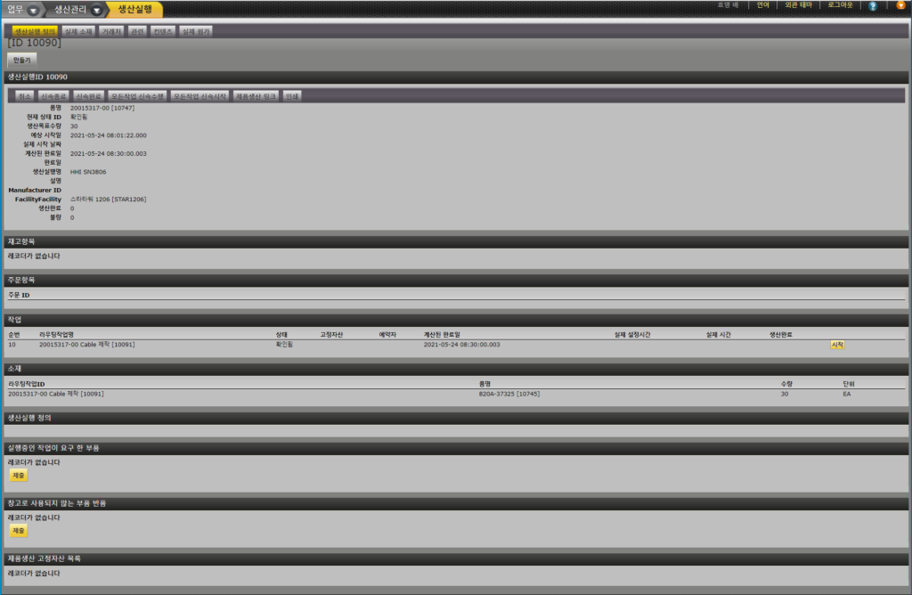 4. “확인” 탭을 클릭하여 생산실행에 대한 확인을 수행하면 필요한 작업 내용이 하단에 표시됩니다.
