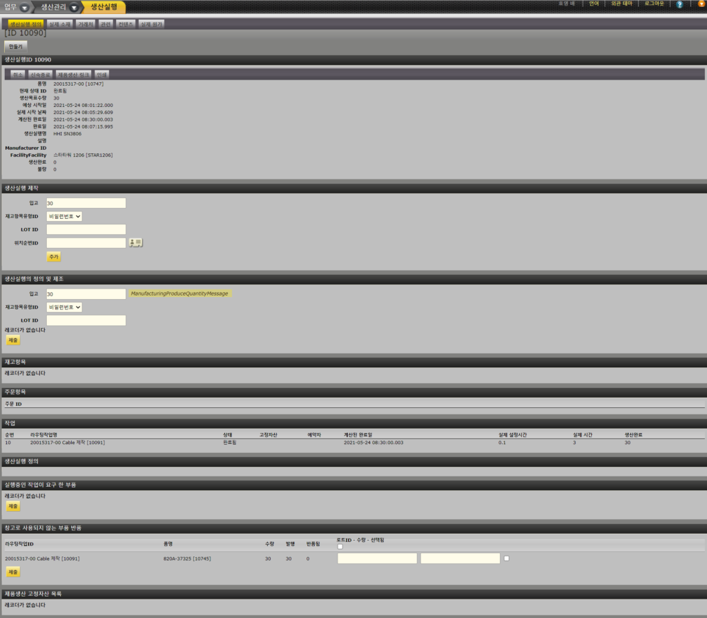 - 생산실행에서 수행된 모든 작업 선언