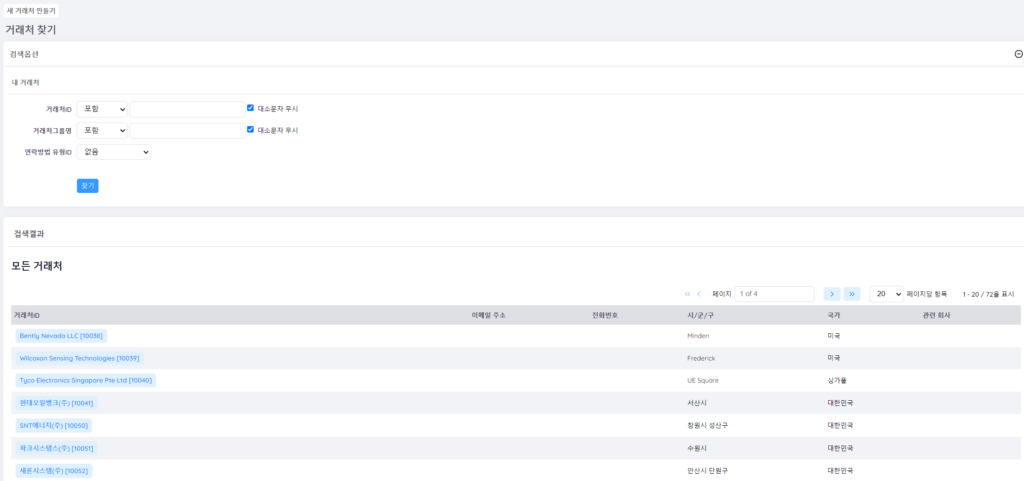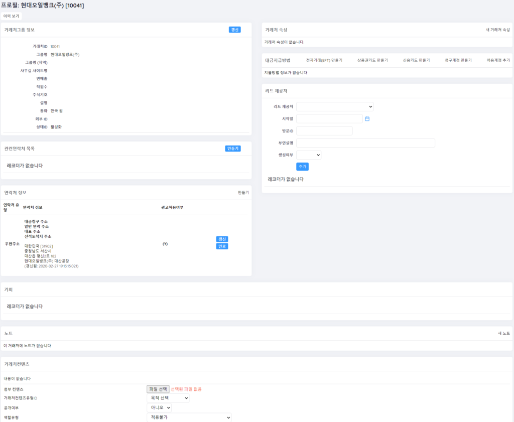 11.2. 거래처 영업자동화 메뉴에서 “거래처”를 선택하면 “계정” 역할이 부여된 거래처가 표시됩니다. 검색된 거래처를 선택하면 회사에 대한 기본 정보가 표시됩니다. “리드 제공처”에서 리드를 제공한 정보를 추가할 수 있습니다. “통신” 버튼을 클릭하여 진행된 통신목록이 표시됩니다.