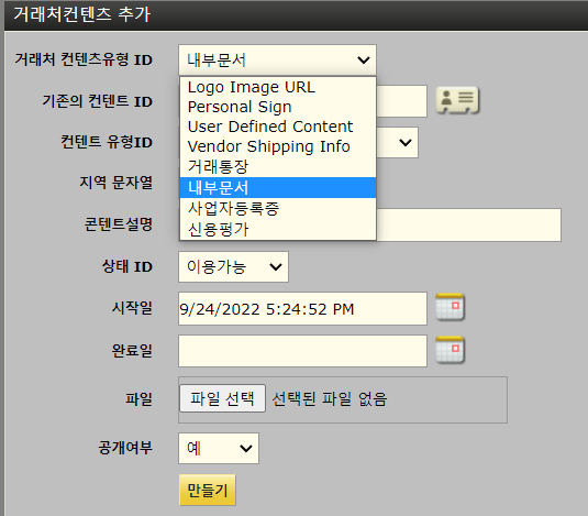 4.2.3.14. 거래처컨텐츠 거래처와 관련된 컨텐츠를 등록합니다. 등록 가능한 분류는 다음과 같습니다. Logo Image URLPersonal SignUser Defiend ContentVendor Shipping Info거래통장내부문서사업자등록증신용평가 Logo Image URL을 이용하면 화면에 거래처의 로고 또는 개인 사진이 표시됩니다.