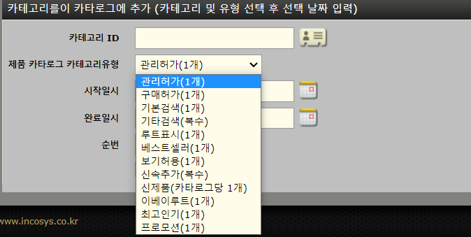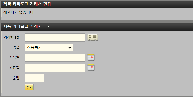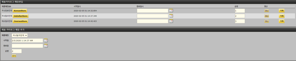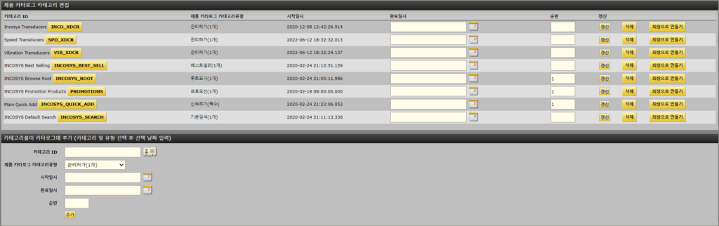 작업 화면 상단에는 카탈로그, 제품매장, 거래처 및 카테고리의 네 가지 하위 탭이 있습니다.