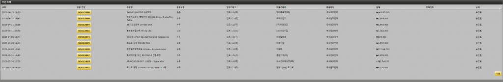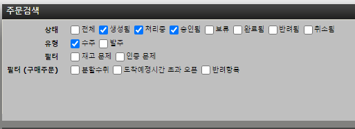 7.4. 주문목록 주문목록은 다음 선택사항에 따라 출력됩니다. 상태 : 주문처리 상태 선택 유형 : 수주 또는 발주 선택 필터 : 재고문제 또는 인증문제 여부 선택 분할 수취, 도착예정 초과, 반려항목 검색된 결과는 상기와 같이 표시됩니다. “다음” : 다음페이지 표시 “이전” : 이전페이지 표시