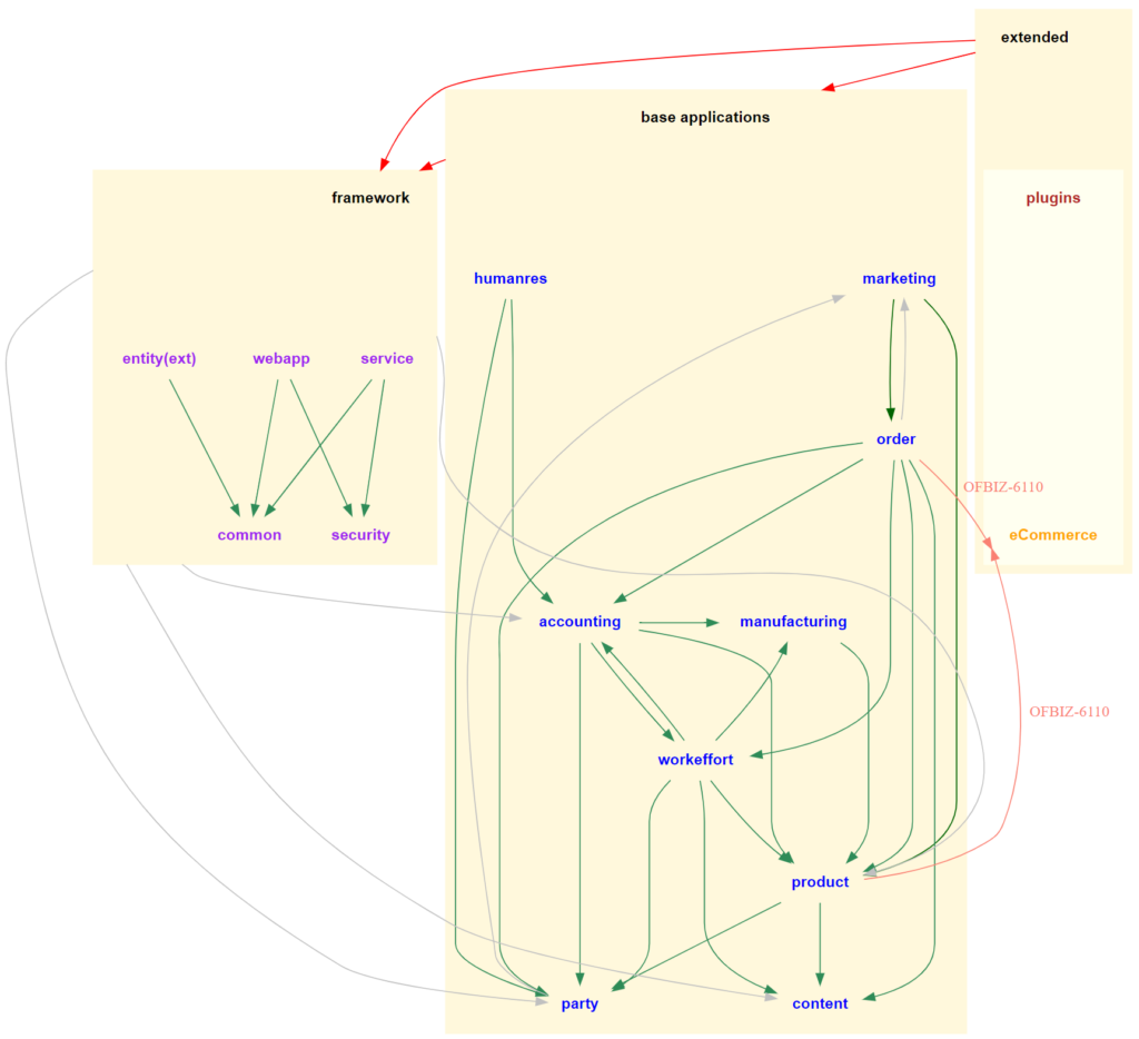 The framework is the underlying data structures and utilities that supply the essential common features used by the base applications and the extended components. These higher level components will have many dependencies on the framework components. There should be no dependencies in the framework on other parts of OFBiz but a few have crept in. They are shown as the gray arrows in the diagram.