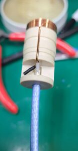 ④ 케이블을 Coil Block 하단에 심선의 피복이 닿을 때 까지 넣은 후 코일의 심선과 Cable의 심선, 코일의 외선과 Cable의 외선을 연결한 후 납땜을 해준다. 이 때 납은 은납을 사용한다