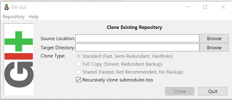 Git GUI 프로그램을 구동하여 “Clone Existing Repository”를 선택하면 서버의 프로젝트를 내컴퓨터에 복사하여 수정할 수 있습니다.